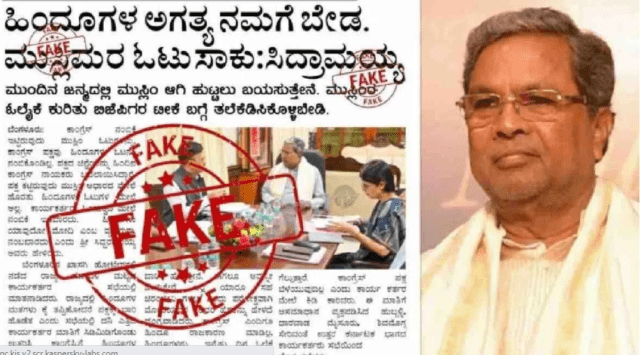 ಹಿಂದುಗಳ ಮತ ನಮಗೆ ಬೇಡ, ಮುಸ್ಲಿಮರ ವೋಟು ನಮಗೆ ಸಾಕು ಎಂದು ಮುಖ್ಯಮಂತ್ರಿ ಸಿದ್ದರಾಮಯ್ಯನವರ ಸುದ್ದಿಯೊಂದು ಹರಿದಾಡುತ್ತಿದೆ. ಫ್ಯಾಕ್ಟ್ಚೆಕ್ ಮಾಡಿ ನೋಡಿದರೆ ಈ ರೀತಿಯಾಗಿ ಯಾವುದೇ ಸುದ್ದಿ ಪತ್ರಿಕೆಗಳಲ್ಲಿ ಪ್ರಕಟವಾಗಿಲ್ಲ. ಈ ರೀತಿಯಾಗಿ ನಕಲಿ ಸುದ್ದಿಯೊಂದನ್ನು ಸೃಷ್ಟಿಸಿ ಸಾಮಾಜಿಕ ಜಾಲತಾಣಗಳಲ್ಲಿ ಹರಿಬಿಡಲಾಗಿದೆ ಎಂದು ತಿಳಿದುಬಂದಿದೆ. ಇನ್ನು ನಕಲಿ ಸುದ್ದಿಯನ್ನು ಸಮಾಜಿಕ ಜಾಲತಾಣಗಳಲ್ಲಿ ಹಂಚಿಕೊಂಡಿರುವ ಬಿಜೆಪಿ ವಿರುದ್ಧ ಕಾಂಗ್ರೆಸ್ ಚುನಾವಣಾ ಆಯೋಗಕ್ಕೆ ದೂರು ನೀಡಿದೆ. ಕಾಂಗ್ರೆಸ್ ನಾಯಕರಾದ ರಮೇಶ್ ಬಾಬು, ವಿಜಯ್ ಮತ್ತಿಕಟ್ಟಿ, ರವಿ ಗೌಡ ಹಾಗೂ ದಿವಾಕರ್ ಅವರು ಬಿಜೆಪಿ ವಿರುದ್ದ ಫೇಕ್ ನ್ಯೂಸ್ ಸೃಷ್ಟಿಸಿದೆ ಎಂದು ಆರೋಪಿಸಿ ಚುನಾವಣಾ ಆಯೋಗಕ್ಕೆ ದೂರು ನೀಡಿದ್ದಾರೆ. ಫೇಕ್ ನ್ಯೂಸ್ ಹರಡುವುದನ್ನು ತಡೆಯಲು ಚುನಾವಣಾ ಆಯೋಗ ಕ್ರಮ ಕೈಗೊಳ್ಳಬೇಕು ಎಂದು ಕಾಂಗ್ರೆಸ್ ಆಗ್ರಹಿಸಿದೆ.