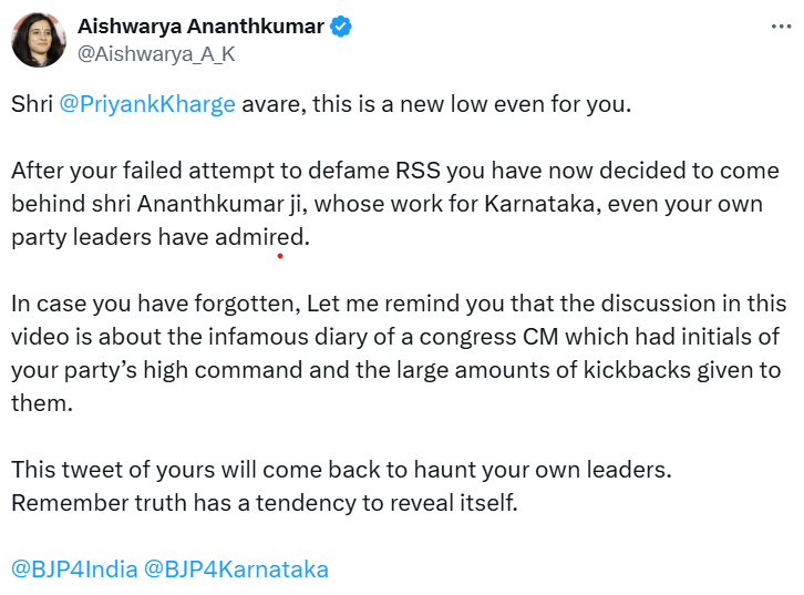 ಬಿಜೆಪಿ ಹೈಕಮಾಡ್ಗೆ 1,800 ಕೋಟಿ ರೂ. ಕಪ್ಪ ನೀಡಿದ್ದನ್ನು ಬಿಎಸ್ವೈ-ಅನಂತ್ ಕುಮಾರ್ ಮಾತಾಡಿಕೊಂಡಿದ್ದು ಯಾರೂ ಮರೆತಿಲ್ಲ ಎಂದು ಎಕ್ಸ್ನಲ್ಲಿ ಪ್ರಿಯಾಂಕ್ ಖರ್ಗೆ ಪೋಸ್ಟ್ ಮಾಡಿದ್ದರು. ಪ್ರಿಯಾಂಕ್ ಆರೋಪಕ್ಕೆ ಅನಂತ್ ಕುಮಾರ್ ಪುತ್ರಿ ಐಶ್ವರ್ಯಾ, ಇಬ್ಬರು ನಾಯಕರು ನಿಮ್ಮ ಪಕ್ಷದ ಡೈರಿಯಿಂದ ಬಂದ ಕಿಕ್ ಬ್ಯಾಕ್ ಲೆಕ್ಕಾಚಾರದ ವಿಚಾರದ ಬಗ್ಗೆ ಸಂಭಾಷಣೆ ಮಾಡಿದ್ದಾರೆ ಎಂದು ಎಕ್ಸ್ನಲ್ಲಿ ಪೋಸ್ಟ್ ಮಾಡಿದ್ದಾರೆ.