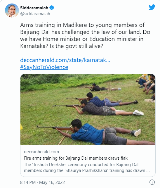 ಈ ಸಂಬಂಧ ಟ್ವೀಟ್ ಮಾಡಿರುವ ಅವರು, ಮಡಿಕೇರಿಯ ಶಾಲಾ ಆವರಣದಲ್ಲಿ ಯುವಜನರಿಗೆ ಶಸ್ತ್ರಾಸ್ತ್ರ ತರಬೇತಿ ನೀಡಿರುವ ಭಜರಂಗದಳ ಕಾನೂನಿಗೆ ಬಹಿರಂಗ ಸವಾಲು ಹಾಕಿದೆ. ಸಂಘಟನೆಯ ನಾಯಕರ ವಿರುದ್ಧ ಕ್ರಮ ಕೈಗೊಳ್ಳದ ಸರ್ಕಾರ ಜೀವಂತ ಇದೆಯೇ? ಎಂದು ಪ್ರಶ್ನೆ ಮಾಡಿದ್ದಾರೆ.