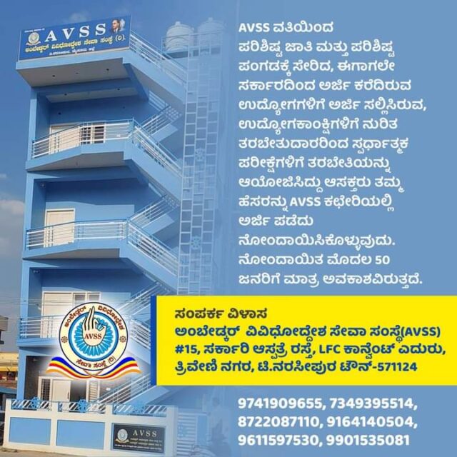 ಅಂಬೇಡ್ಕರ್ ವಿವಿಧೋದ್ದೇಶ ಸೇವಾ ಸಂಸ್ಥೆ (AVSS), 15, ಸರ್ಕಾರಿ ಆಸ್ಪತ್ರೆ ರಸ್ತೆ, LFC ಕಾನ್ವೆಂಟ್ ಎದುರು, ತ್ರಿವೇಣಿ ನಗರ, ಟಿ.ನರಸೀಪುರ