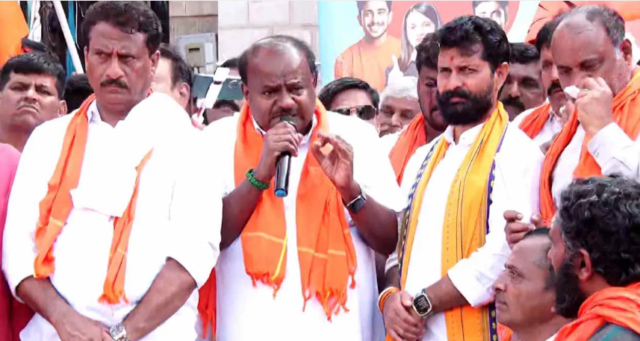 ಮಂಡ್ಯ ಜಿಲ್ಲೆಯ ಕೆರಗೋಡು ಗ್ರಾಮದಲ್ಲಿ ನಡೆಯುತ್ತಿರುವ ಪ್ರತಿಭಟನೆಯಲ್ಲಿ ಕೇಸರಿ ಶಾಲು ಧರಿಸಿ ಭಾಗಿಯಾಗಿದ ಕುಮಾರಸ್ವಾಮಿ, ಜೈ ಶ್ರೀರಾಮ್ ಘೋಷಣೆಯೊಂದಿಗೆ ಭಾಷಣ ಆರಂಭಿಸಿದರು.