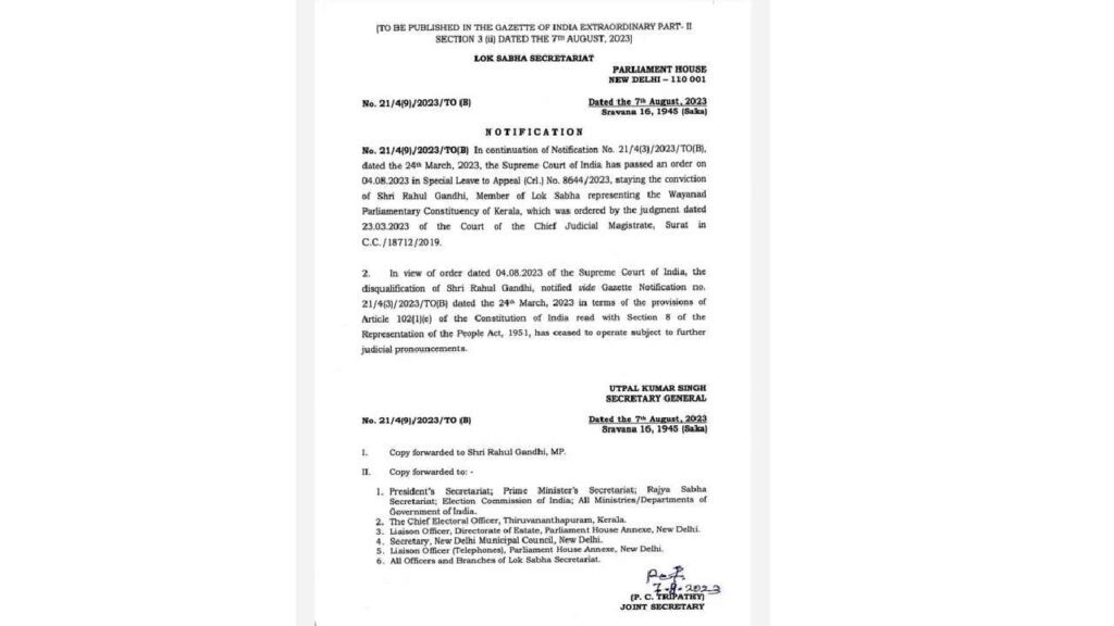 ಕಾಂಗ್ರೆಸ್ ನಾಯಕ ರಾಹುಲ್ ಗಾಂಧಿಯವರ ಲೋಕಸಭಾ ಸದಸ್ಯತ್ವ ಸ್ಥಾನವನ್ನು ಪುನಃಸ್ಥಾಪಿಸಲಾಗಿದ್ದು, ಇಂದಿನಿಂದ ಕಲಾಪದಲ್ಲಿ ಪಾಲ್ಗೊಳ್ಳಲಿದ್ದಾರೆ.