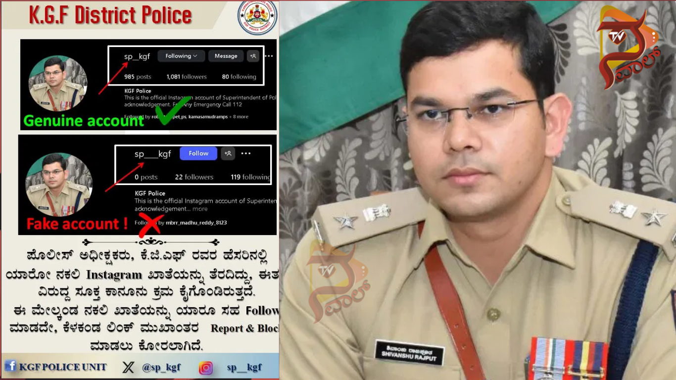 ಕೆಜಿಎಫ್ ಜಿಲ್ಲಾ ಪೊಲೀಸ್ ಎಸ್ಪಿ ಶಿವಾಂಶು ರಜಪೂತ್ ಅವರ ಭಾವಚಿತ್ರ ಇರುವ ಜಿಲ್ಲಾ ಪೊಲೀಸ್ ಅಧಿಕೃತ ಇನ್ಸ್ಟಾಗ್ರಾಂ ಖಾತೆಯನ್ನು ನಕಲು ಮಾಡಿದ್ದಾರೆ. ನಕಲಿ ಖಾತೆಯನ್ನು ಎಸ್ಪಿ-ಕೆಜಿಎಫ್ ಹೆಸರಿನಲ್ಲಿ ತೆರೆದಿರುವ ದುಷ್ಕರ್ಮಿಗಳು ಪೊಲೀಸ್ ಅಧಿಕಾರಿಯನ್ನೂ ಬಿಟ್ಟಿಲ್ಲ ಎಂದು ತಿಳಿದಿದೆ.