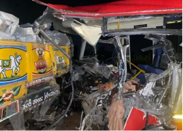 ಭಾನುವಾರ ರಾತ್ರಿ 9:30ಕ್ಕೆ ಆಂಧ್ರ ಪ್ರದೇಶದ ಬಲಿಜಖಂಡ್ರಿಗದಿಂದ ಬೆಂಗಳೂರಿಗೆ ಬರುತ್ತಿದ್ದ ಬಸ್ ತಡ ರಾತ್ರಿ 1:45ರ ಸಮಯಕ್ಕೆ ರಾಷ್ಟ್ರೀಯ ಹೆದ್ದಾರಿ ಹೊಸಕೋಟೆ ಸಮೀಪದ ಮೈಲಾಪುರ ಗೇಟ್ ಬಳಿ ಕಲ್ಲು ತುಂಬಿದ ಲಾರಿಗೆ ಡಿಕ್ಕಿ ಹೊಡೆದಿದೆ. ಘಟನೆಗೆ ಚಾಲಕನ ನಿರ್ಲಕ್ಷ್ಯವೇ ಕಾರಣ ಎನ್ನಲಾಗ್ತಿದೆ.