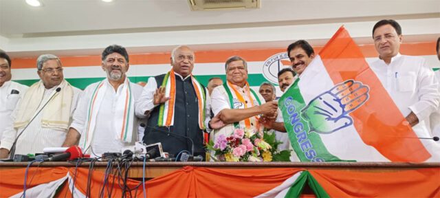 ಎಐಸಿಸಿ ಅಧ್ಯಕ್ಷ ಮಲ್ಲಿಕಾರ್ಜುನ ಖರ್ಗೆ ಮತ್ತು ಇತರ ನಾಯಕರ ಉಪಸ್ಥಿತಿಯಲ್ಲಿ ಕೆಪಿಸಿಸಿ ಅಧ್ಯಕ್ಷ ಡಿ.ಕೆ. ಶಿವಕುಮಾರ್ ಬಿ-ಫಾರ್ಮ್ ವಿತರಿಸಿದರು.