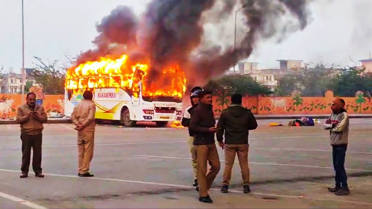 ಮಥುರಾ (ಉತ್ತರಪ್ರದೇಶ): ತೆಲಂಗಾಣದ ಜನರಿಂದ ತುಂಬಿದ್ದ ಬಸ್ವೊಂದು ಮಥುರಾದಲ್ಲಿ ಹೊತ್ತಿ ಉರಿದಿದೆ. ಸುದ್ದಿ ತಿಳಿದ ಪೊಲೀಸರು ಮತ್ತು ಅಗ್ನಿಶಾಮಕ ದಳ ಸ್ಥಳಕ್ಕೆ ದೌಡಾಯಿಸಿ ರಕ್ಷಣಾ ಕಾರ್ಯಾಚರಣೆ ಕೈಗೊಂಡರು.