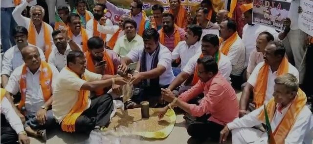 ಬಿಜೆಪಿ ಕಾರ್ಯಕರ್ತರು ಹುರುಳಿ ಬಿತ್ತನೆ ಮಾಡಲು ಸೇರಿನಲ್ಲಿ ಅಳೆದು ಪ್ಯಾಕ್ ಮಾಡಿದ್ದಾರೆ.