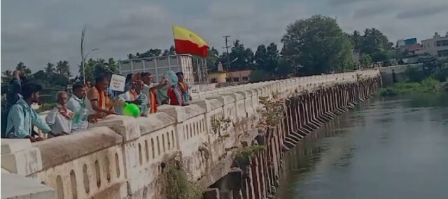 ಶ್ರೀರಂಗಪಟ್ಟಣದಲ್ಲಿ ವೆಲ್ಲೆಸ್ಲಿ ಸೇತುವೆ ಮೇಲಿಂದ ಕಾವೇರಿ ನದಿಗೆ ಬಿಸ್ಲರಿ ನೀರು ಸುರಿದು ಮಂಡ್ಯ ರಕ್ಷಣಾ ವೇದಿಕೆ ವತಿಯಿಂದ ವಿನೂತನವಾಗಿ ಪ್ರತಿಭಟನೆ ನಡೆಸಲಾಗಿದೆ.