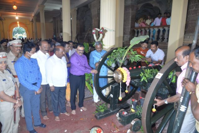 ಮೈಸೂರು(Mysuru): ದಸರಾ ಮಹೋತ್ಸವಕ್ಕೆ ದಿನಗಣನೆ ಆರಂಭವಾಗಿದ್ದು, ಆನೆಗಳು , ಕುದುರೆಗಳ ಸಮ್ಮುಖದಲ್ಲಿ ಫಿರಂಗಿ ಸಿಡಿಸಿ ತಾಲೀಮು ನಡೆಸುವ ಪ್ರಕ್ರಿಯೆಗೆ ಚಾಲನೆ ನೀಡುವ ಸಲುವಾಗಿ ಫಿರಂಗಿ ಗಾಡಿಗಳಿಗೆ ಸಚಿವ ಎಸ್.ಟಿ.ಸೋಮಶೇಖರ್ ಪೂಜೆ ಸಲ್ಲಿಸಿದರು