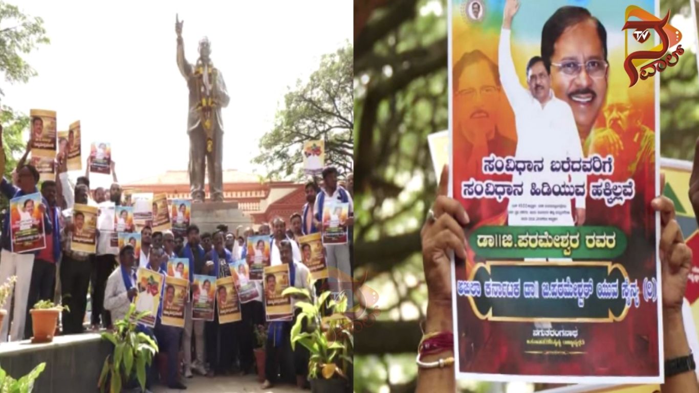 ತುಮಕೂರು ನಗರದ ಟೌನ್ಹಾಲ್ ವೃತ್ತದಲ್ಲಿ ಪರಮೇಶ್ವರ್ ಅಭಿಮಾನಿಗಳು ಜಮಾವಣೆಗೊಂಡು, ಮುಂದಿನ ಸಿಎಂ ಪರಮೇಶ್ವರ್ಗೆ ಜೈ ಎಂದು ಘೋಷಣೆ ಕೂಗಿದ್ದಾರೆ. ಆಗಲೇಬೇಕು, ಆಗಲೇಬೇಕು ದಲಿತ ಸಿಎಂ ಆಗಲೇಬೇಕು ಎಂದು ಉದ್ಘೋಷ ಕೂಗಿದ್ದಾರೆ. ಅಲ್ಲದೇ ಸಂವಿಧಾನ ಬರೆದವರಿಗೆ ಸಂವಿಧಾನ ಹಿಡಿಯುವ ಹಕ್ಕಿಲ್ಲವೇ ಎಂಬ ಪೋಸ್ಟರ್ ಪ್ರದರ್ಶನ ಮಾಡಿ ಪ್ರತಿಭಟನೆ ನಡೆಸಿದ್ದಾರೆ.