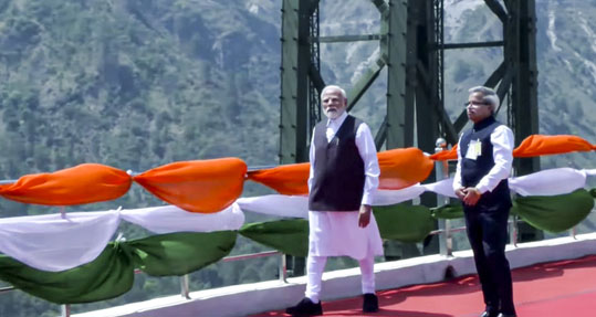 ಶ್ರೀನಗರ: ಭಯೋತ್ಪಾದಕ ದಾಳಿಯ ಬಳಿಕ ಜಮ್ಮು ಮತ್ತು ಕಾಶ್ಮೀರಕ್ಕೆ ಮೊದಲ ಬಾರಿಗೆ ಭೇಟಿ ನೀಡಿದ ಪ್ರಧಾನಿ ನರೇಂದ್ರ ಮೋದಿ, ಇಂದು ವಿಶ್ವದ ಅತಿ ಎತ್ತರದ ರೈಲು ಸೇತುವೆಯಾದ ಚೆನಾಬ್ ಬ್ರಿಜ್ ಅನ್ನು ಅಧಿಕೃತವಾಗಿ ಉದ್ಘಾಟಿಸಿದರು. ಇದೇ ಸಂದರ್ಭದಲ್ಲಿ ಅಂಜಿ ನದಿಯ ಮೇಲೆ ನಿರ್ಮಿಸಲಾದ ಭಾರತದ ಮೊಟ್ಟ ಮೊದಲ ಕೇಬಲ್-ಸ್ಟೇಡ್ ರೈಲು ಸೇತುವೆಯನ್ನೂ ಉದ್ಘಾಟಿಸಿದರು.