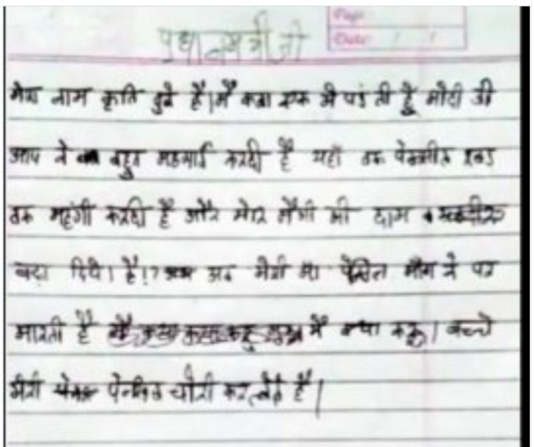 ಉತ್ತರ ಪ್ರದೇಶದ ಕನೌಜ್ ಜಿಲ್ಲೆಯ ಛಿಬರ್ಮವು ಪಟ್ಟಣದ ಆರು ವರ್ಷ ವಯಸ್ಸಿನ ಕೃತಿ ದುಬೆ ಪ್ರಧಾನಿಗೆ ಹಿಂದಿಯಲ್ಲಿ ಬರೆದಿರುವ ಪತ್ರವು ಸಾಮಾಜಿಕ ಜಾಲತಾಣಗಳಲ್ಲಿ ಹರಿದಾಡಿದೆ.