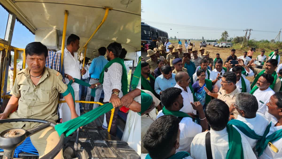 ಇದೇ ವೇಳೆ ಎರಡು ಬಸ್ಸುಗಳನ್ನು ಚಾಲಕರು ಪಕ್ಕದಲ್ಲಿ ದಾಟಿಸಿಕೊಂಡು ಮುಂದೆ ಬಂದರು. ಇದರಿಂದ ಆಕ್ರೋಶಗೊಂಡ ರೈತರು ಬೆನ್ನಟ್ಟಿ ಬಂದು ಬಸ್ ಅಡ್ಡಗಟ್ಟಿದರು. ಒಳಗೆ ಹತ್ತಿ ಬಸ್ ಚಾಲಕರ ಕೈ ಮತ್ತು ಸ್ಟೇರಿಂಗ್ ಅನ್ನು ಹಸಿರು ಟವಲ್ನಿಂದ ಕಟ್ಟಿ ಸರ್ಕಾರದ ವಿರುದ್ಧ ಘೋಷಣೆ ಕೂಗಿದರು.