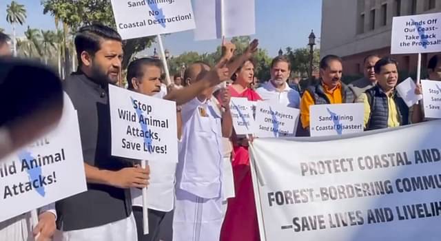 ನವದೆಹಲಿ: ಕೇರಳದಲ್ಲಿ ವನ್ಯಜೀವಿಗಳ ದಾಳಿ ಮತ್ತು ಮರಳು ಗಣಿಗಾರಿಕೆಯಿಂದ ಕರಾವಳಿ ಪ್ರದೇಶದ ಜನರನ್ನು ರಕ್ಷಣೆ ಮಾಡಬೇಕೆಂಬ ಉದ್ದೇಶದೊಂದಿಗೆ ಲೋಕಸಭೆ ವಿರೋಧ ಪಕ್ಷದ ನಾಯಕ ರಾಹುಲ್ ಗಾಂಧಿ, ವಯನಾಡ್ ಸಂಸದೆ ಪ್ರಿಯಾಂಕಾ ಗಾಂಧಿ ವಾದ್ರಾ ಸೇರಿದಂತೆ ಕಾಂಗ್ರೆಸ್ನ ಸಂಸದರು ಇಂದು (ಗುರುವಾರ) ಸಂಸತ್ ಆವರಣದಲ್ಲಿ ಪ್ರತಿಭಟನೆ ನಡೆಸಿದ್ದಾರೆ.