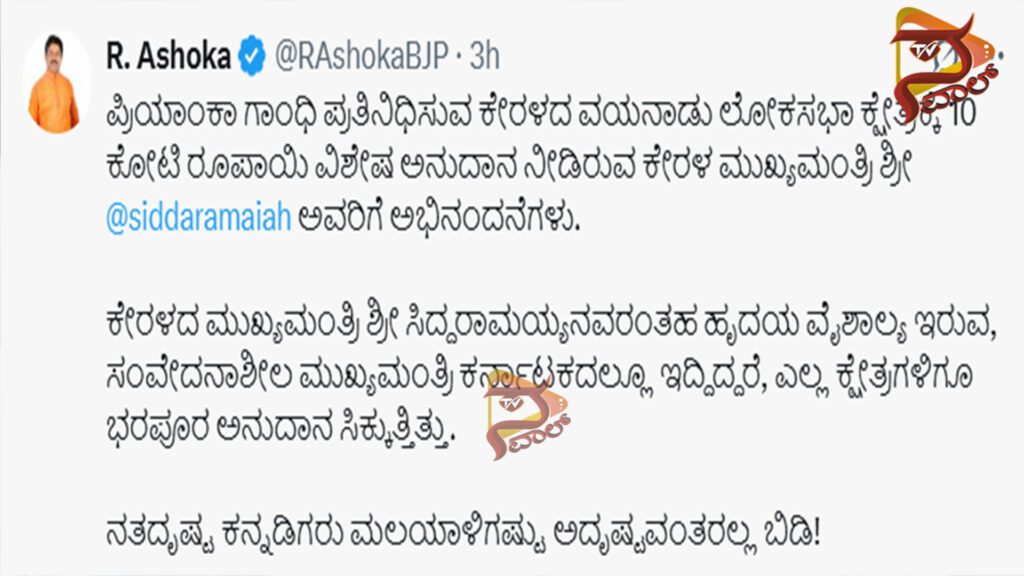 ‘‘ಕೇರಳದ ಮುಖ್ಯಮಂತ್ರಿ ಶ್ರೀ ಸಿದ್ದರಾಮಯ್ಯನವರಂತಹ ಹೃದಯ ವೈಶಾಲ್ಯ ಇರುವ, ಸಂವೇದನಾಶೀಲ ಮುಖ್ಯಮಂತ್ರಿ ಕರ್ನಾಟಕದಲ್ಲೂ ಇದ್ದಿದ್ದರೆ, ಎಲ್ಲ ಕ್ಷೇತ್ರಗಳಿಗೂ ಭರಪೂರ ಅನುದಾನ ಸಿಕ್ಕುತ್ತಿತ್ತು. ನತದೃಷ್ಟ ಕನ್ನಡಿಗರು ಮಲಯಾಳಿಗಷ್ಟು ಅದೃಷ್ಟವಂತರಲ್ಲ ಬಿಡಿ!’’ ಎಂದು ಎಕ್ಸ್ ಸಂದೇಶದ ಮೂಲಕ ಅಶೋಕ್ ತಿವಿದಿದ್ದಾರೆ.