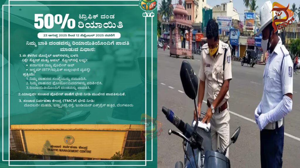 ದಂಡ ಬಾಕಿ ಉಳಿಸಿಕೊಂಡಿರುವ ವಾಹನ ಮಾಲೀಕರು ಆ.23ರಿಂದ ಸೆ.12ರವರೆಗೂ ದಂಡದ ಕೇವಲ ಶೇ.50ರಷ್ಟನ್ನು ಪಾವತಿಸಬಹುದು. ಹಲವು ವರ್ಷಗಳಿಂದ ಟ್ರಾಫಿಕ್ ದಂಡ ಕಟ್ಟದೇ ಹಾಗೇ ಉಳಿಸಿಕೊಂಡವರಿಗೆ ಈ ರಿಯಾಯಿತಿ ನೀಡಲಾಗಿದೆ.