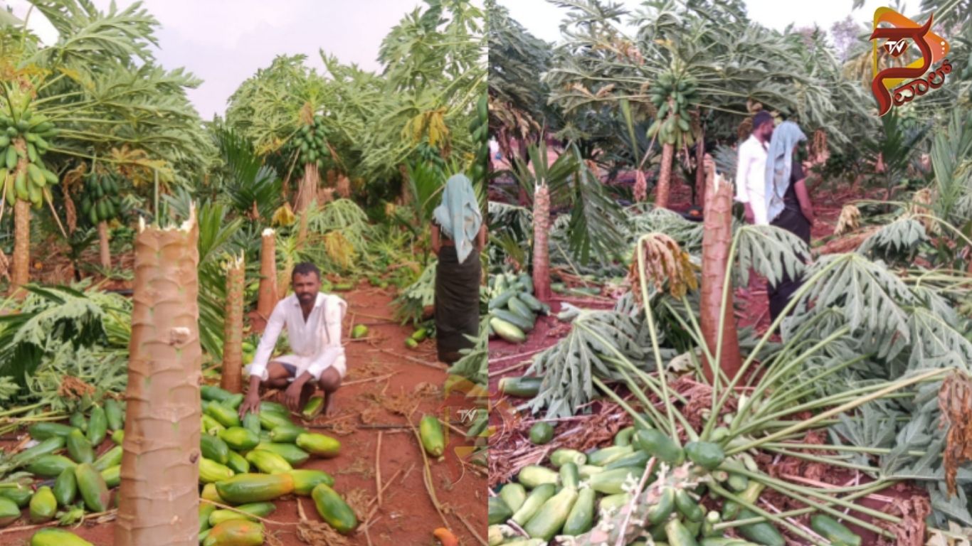 ಜಿಲ್ಲೆಯ ಕೂಡ್ಲಿಗಿ ತಾಲೂಕಿನ ಅಮರದೇವರಗುಡ್ಡ ಗ್ರಾಮದಲ್ಲಿ ಮಳೆಗೆ ಪಪ್ಪಾಯ, ಅಡಿಕೆ ಸೇರಿ ತೋಟಗಾರಿಕೆ ಬೆಳೆ ಸಂಪೂರ್ಣ ನಾಶವಾಗಿದೆ. ಕಟಾವಿಗೆ ಬಂದಿದ್ದ ಪಪ್ಪಾಯ ಬೆಳೆ ಕಳೆದುಕೊಂಡು ರೈತರು ಕಂಗಾಲಾಗಿದ್ದಾರೆ. ರೈತ ಬೀರಪ್ಪ ತನ್ನ 4 ಎಕರೆ ಜಮೀನಿನಲ್ಲಿ, ಲಕ್ಷಾಂತರ ಹಣ ಖರ್ಚು ಮಾಡಿ ಪಪ್ಪಾಯ ಬೆಳೆದಿದ್ದ. ಇದೀಗ ಲಕ್ಷಾಂತರ ಮೌಲ್ಯದ ಬೆಳೆ ಕಳೆದುಕೊಂಡಿರುವ ರೈತ ದಿಕ್ಕು ತೋಚದಂತಾಗಿದ್ದಾನೆ.