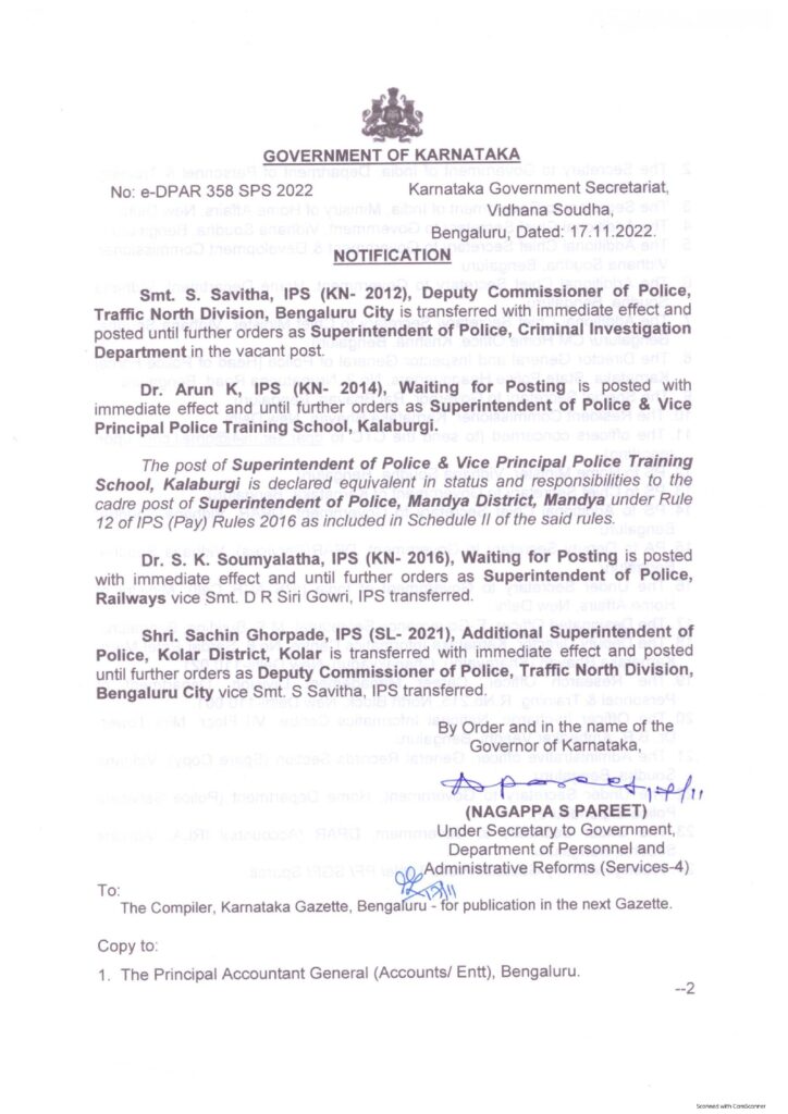 ಬೆಂಗಳೂರು ಉತ್ತರ ವಿಭಾಗದ ಸಂಚಾರಿ ಉಪ ಆಯುಕ್ತರಾಗಿ ಕಾರ್ಯನಿರ್ವಹಿಸುತ್ತಿದ್ದ ಎಸ್.ಸವಿತಾ ಅವರನ್ನು, ಅಪರಾಧ ತನಿಖಾ ಇಲಾಖೆ ಪೊಲೀಸ್ ಸೂಪರಿಂಟೆಂಡೆಂಟ್ ಹುದ್ದೆಗೆ, ಡಾ.ಅರುಣ್ ಕೆ ಅವರನ್ನು ಕಲಬುರ್ಗಿಯ ಪೊಲೀಸ್ ತರಬೇತಿ ಶಾಲೆಯ ಉಪ ಪ್ರಾಂಶುಪಾಲ ಹಾಗೂ ಪೊಲೀಸ್ ಸೂಪರಿಂಟೆಂಡೆಂಟ್ ಹುದ್ದೆಗೆ ವರ್ಗಾಯಿಸಲಾಗಿದ್ದು, ಡಾ.ಎಸ್.ಕೆ.ಸೌಮ್ಯಲತಾ ಅವರನ್ನು ರೈಲ್ವೆಯ ಪೊಲೀಸ್ ಸೂಪರಿಂಟೆಂಡೆಂಟ್ ಹುದ್ದೆಗೆ ನೇಮಿಸಲಾಗಿದೆ.