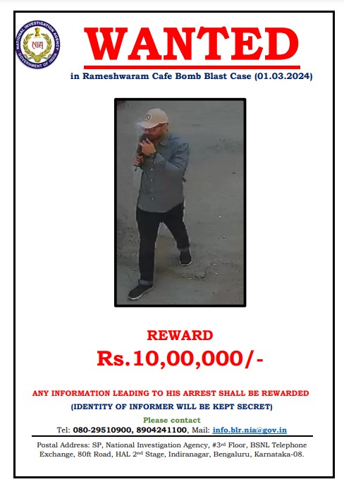 ಬೆಂಗಳೂರು: ದಿ ರಾಮೇಶ್ವರಂ ಕೆಫೆ ಸ್ಫೋಟ ಪ್ರಕರಣದ ಆರೋಪಿಯ ಬಂಧನಕ್ಕೆ ಸಹಕಾರಿಯಾಗುವಂಥಹ ಸುಳಿವು ನೀಡಿದವರಿಗೆ ಎನ್ಐಎ (ರಾಷ್ಟ್ರೀಯ ತನಿಖಾ ದಳ) 10 ಲಕ್ಷ ರೂ. ನಗದು ಬಹುಮಾನ ಘೋಷಿಸಿದೆ.